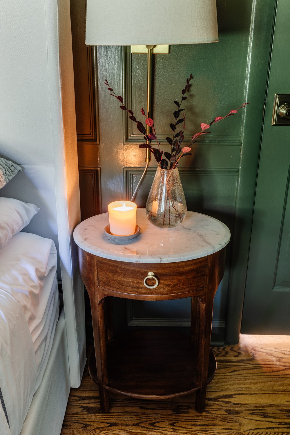 I discovered essentially the most lovely marble-top walnut-stained slim bedside tables that slip proper into our tight house and immediately make the entire room really feel extra intentional. Drawers for just a little hidden storage. Marble for a touch of fancy. Complete small-room win.