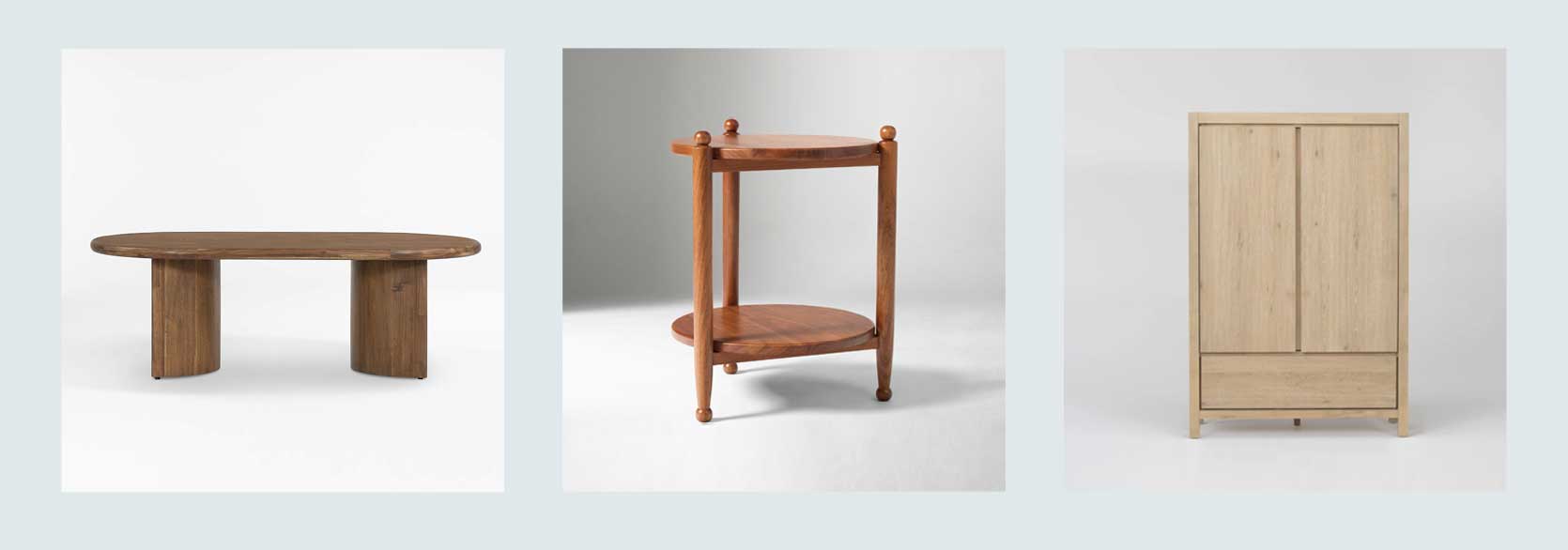 From Left: Panos Brown Stable Acacia Wooden 51″ Oval Espresso Desk | Pierce & Ward Wooden Tiered Facet Desk (18″) | Voyage Pure 2-Door 3-Drawer Bed room Armoire Closet By Nate Berkus + Jeremiah Brent