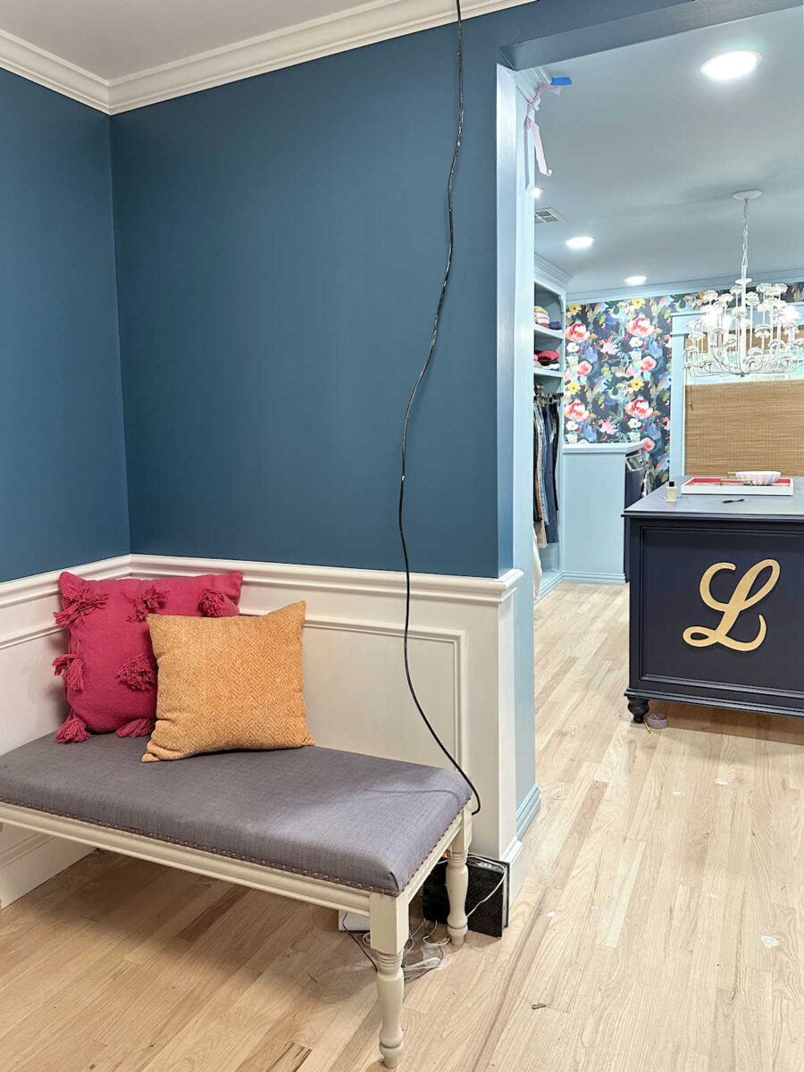 I made a decision on that one as a result of it’s a enjoyable sample and it’s velvet. Y’all know the way a lot I really like velvet. And I like that it’ll deliver the teal right down to the underside portion of the lobby. However that teal on the bench will then enable me to make use of colourful pillows on the bench to tie in with the pink within the closet and the orange within the bed room. I doubt that I’ll keep on with these specific pillows that I have already got, however that is the final concept.