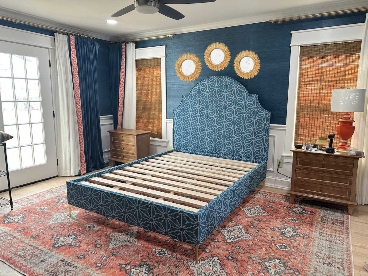 However, in fact, that bed room was completely totally different from our present one. The headboard itself wasn’t actually a function, and it was a lot decrease, leaving extra wall area above it for the sunburst mirror. The bedding was additionally form of plain. As a substitute of constructing the headboard and bedding the function in that room, the wall was the function, and that allowed me to hold one thing ornamental above the headboard.