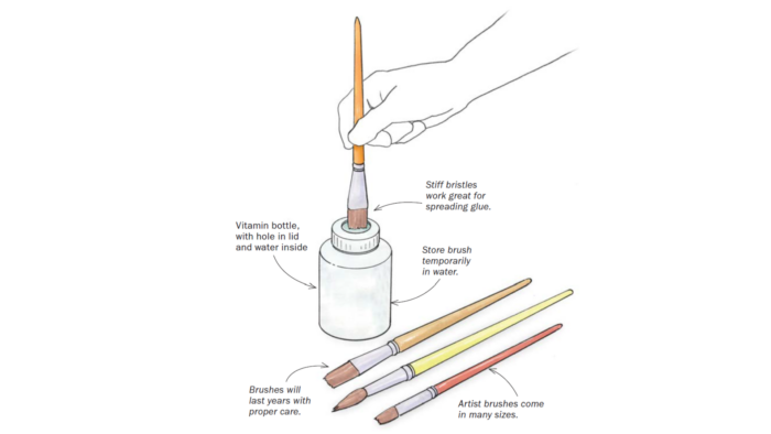 Whereas many woodworkers use low-cost flux brushes for glue-ups, I exploit artist brushes, which have stiffer bristles and are available quite a lot of sizes. To maintain a brush prepared for the following day, I retailer it in a water-filled vitamin bottle with a gap lower within the prime. Earlier than the following use, I swish the comb within the water and shake out the surplus. When the undertaking is completed, I swish and shake the comb once more and let it dry. My bigger brushes have been in use for years, and the water lasts for months. —JAY WOOD, Fairfax, Calif.