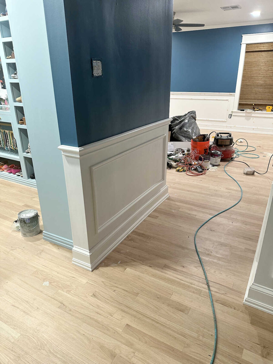 My first precedence this weekend was to get all the image body molding minimize and connected, in order that’s the place I began. As soon as all of that was put in, and I began filling the nail holes with wooden filler, I then wanted to resolve what to do about this huge hole on the backside of this wall. That’s not solely a vertical hole between the underside of the baseboard and the ground, but it surely’s additionally a niche between the entrance fringe of the baseboard and the place the flooring begins. So I knew that this might require one thing a lot bigger than a easy shoe molding or quarter spherical molding.