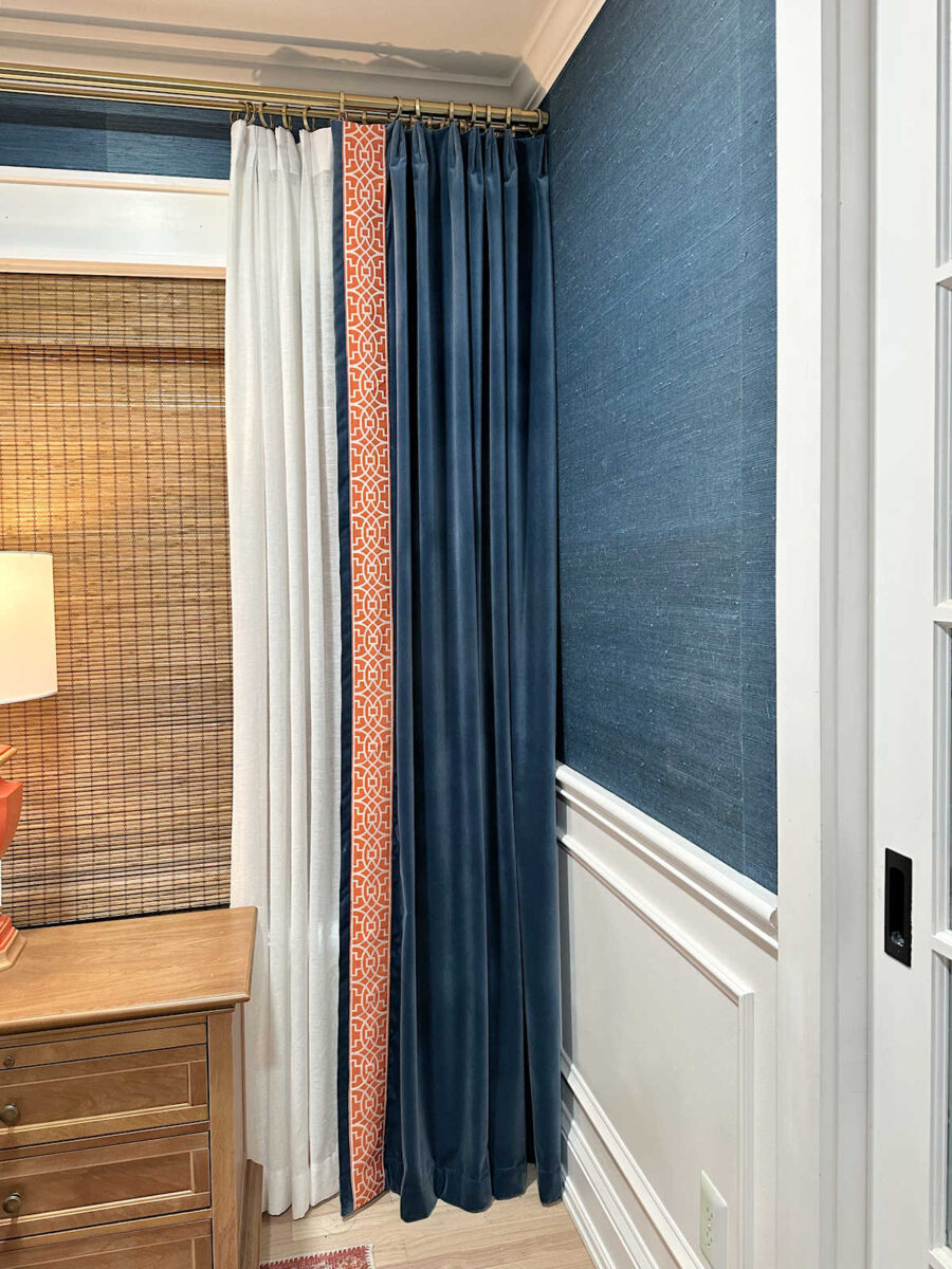I didn’t get an image of the opposite completed panel that I hung as a result of Matt was nonetheless in mattress, and that nook is the place I pile the entire pillows from the mattress when the mattress isn’t made. 😀 So that you’ll have to attend to get the entire image of the mattress wall with the completed draperies.