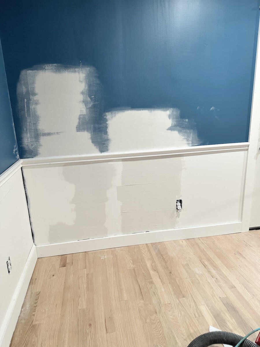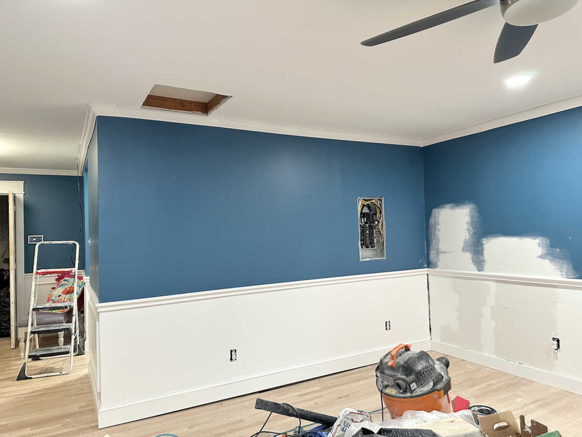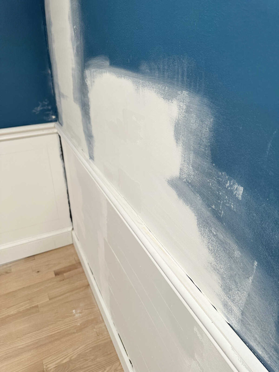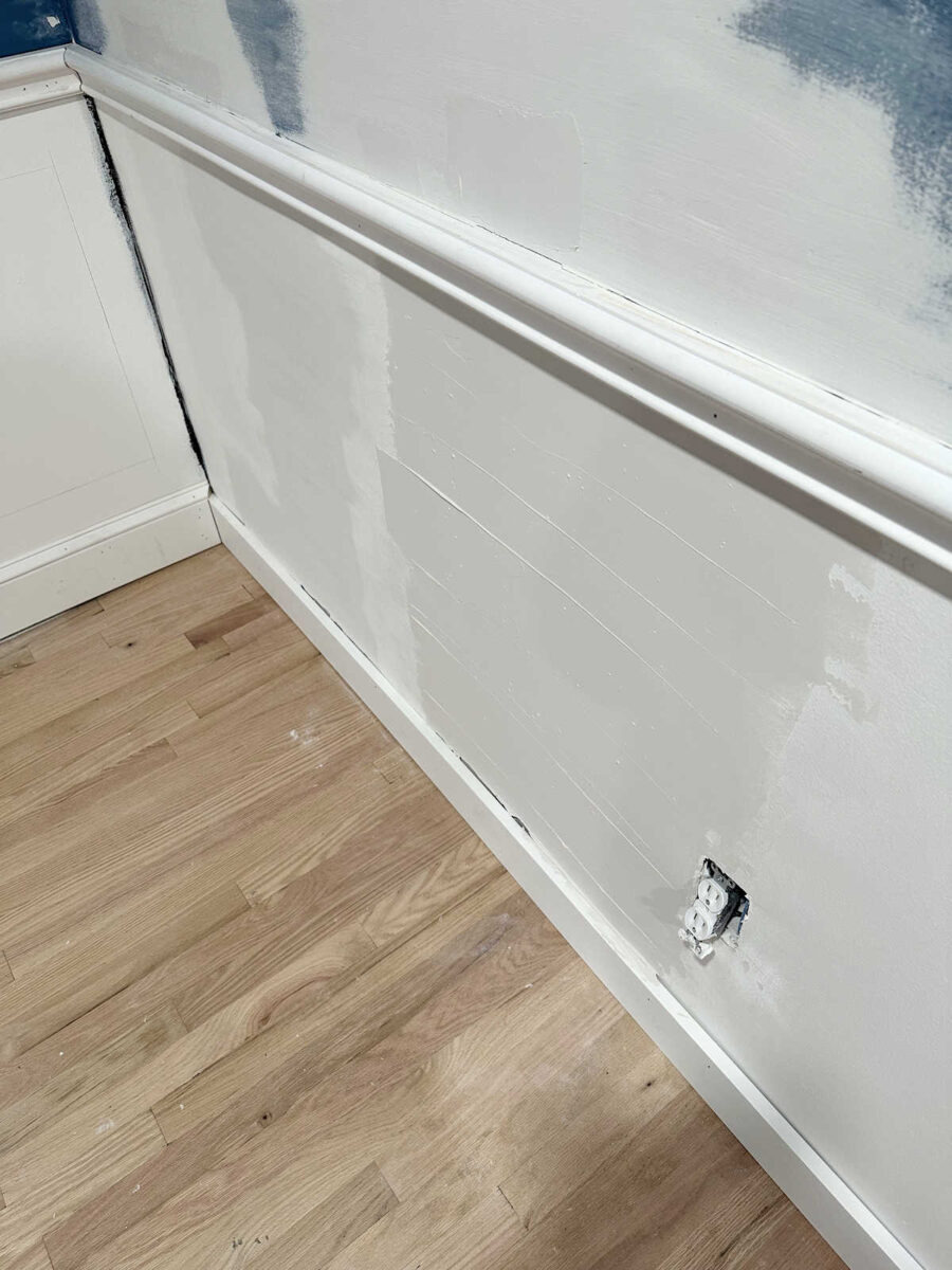 So after layers of drywall mud, I’ve constructed out that dip within the wall in order that it’s extra even with the chair rail. There’s nonetheless a bit of little bit of a spot in some areas, however these are caulkable.