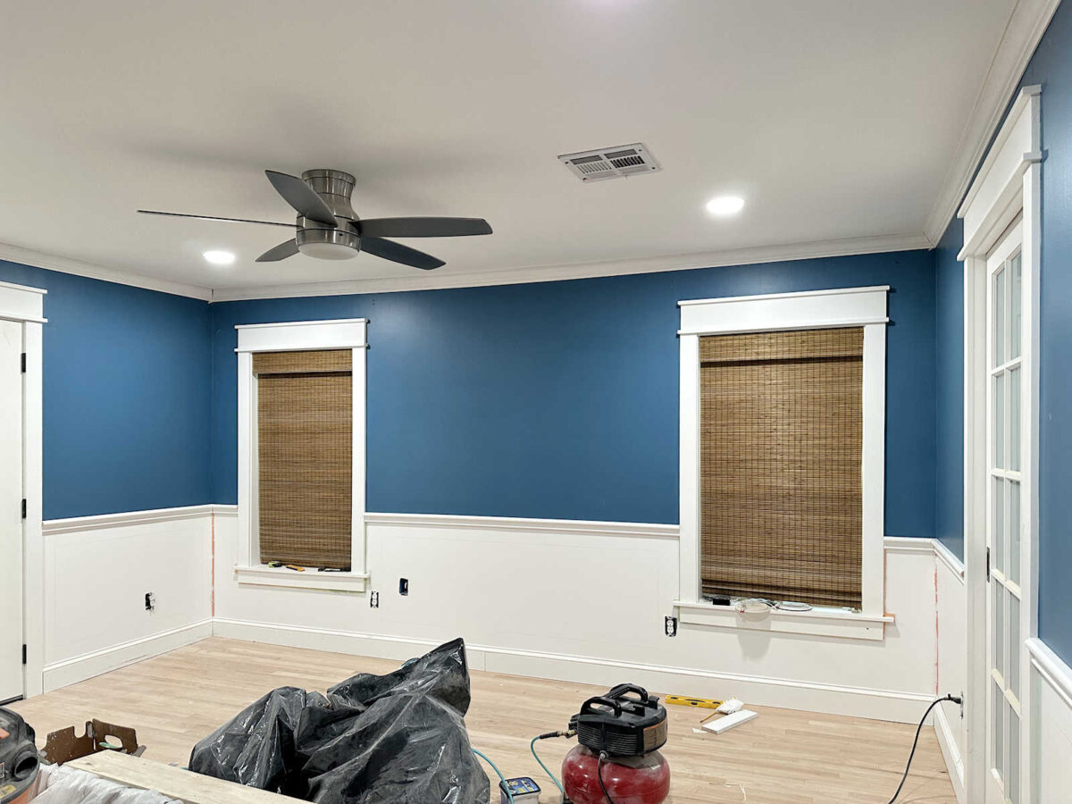 My largest concern earlier than beginning the crown molding was that the crown would spotlight simply how unlevel and wonky the partitions are. I used to be afraid that it might particularly present above the doorways and home windows. And whereas it’s actually not good, particularly in that one downside nook to the left of that left window, I believe it appears to be like fairly good.