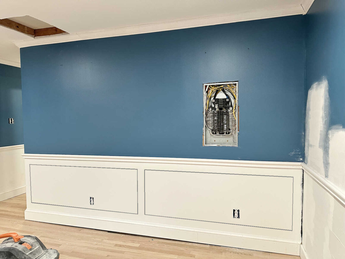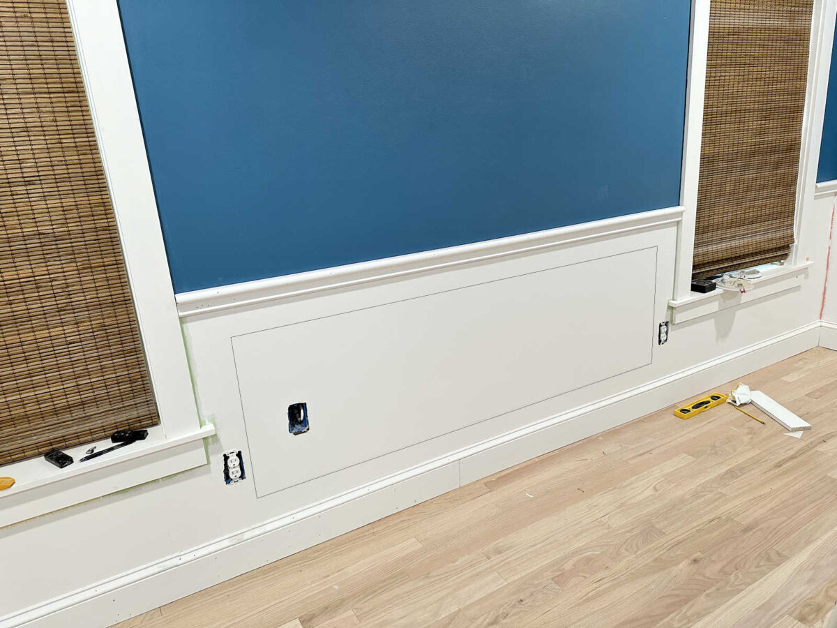 I used to be a bit of bit involved about this wall due to the shops. I wasn’t certain if I’d have the ability to use the identical spacing for the image body molding that I’ve used on the entire different partitions. But it surely appears to be like prefer it’ll work out completely! That was a aid. The very last thing I wanted was one other downside wall on this room. 😀