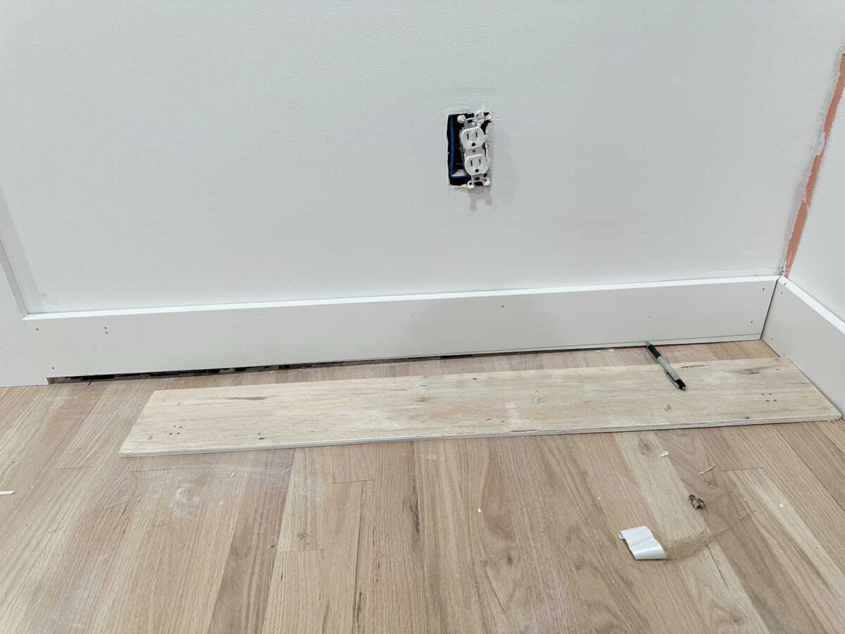 After which I used my desk noticed to chop alongside that line. I repeated that course of on the baseboard on the opposite wall in order that the 2 items met completely within the nook.
