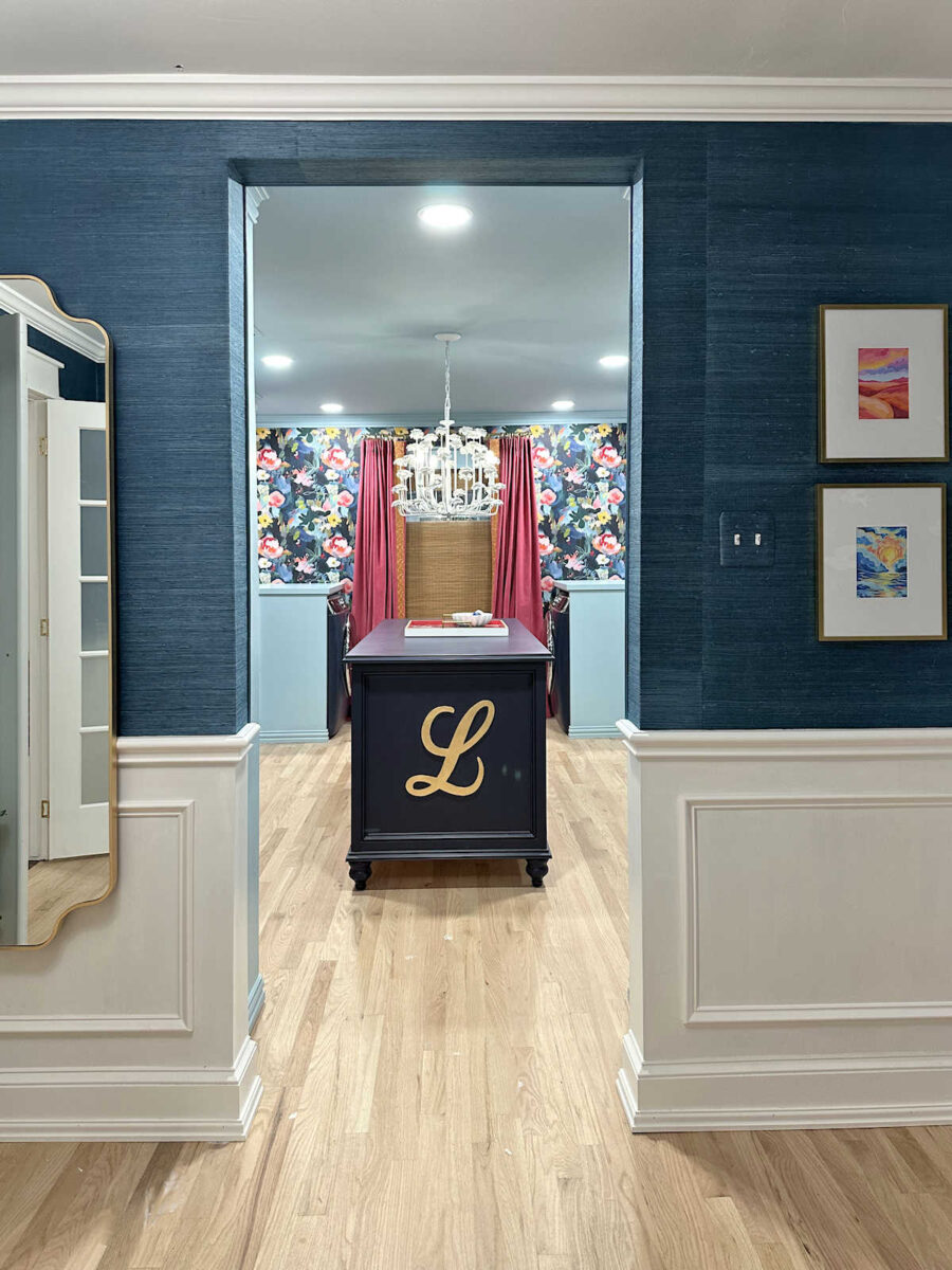 Right here’s a take a look at the completed lobby. I actually love how this space turned out. Since our bed room suite is off of the music room, I actually like having this lobby as a little bit of a buffer zone that provides some separation between the music room and our bed room. You possibly can see a peek of the bed room from the music room, however you possibly can’t see the entire thing from the doorway. So there’s nonetheless a little bit of thriller there that attracts individuals in.