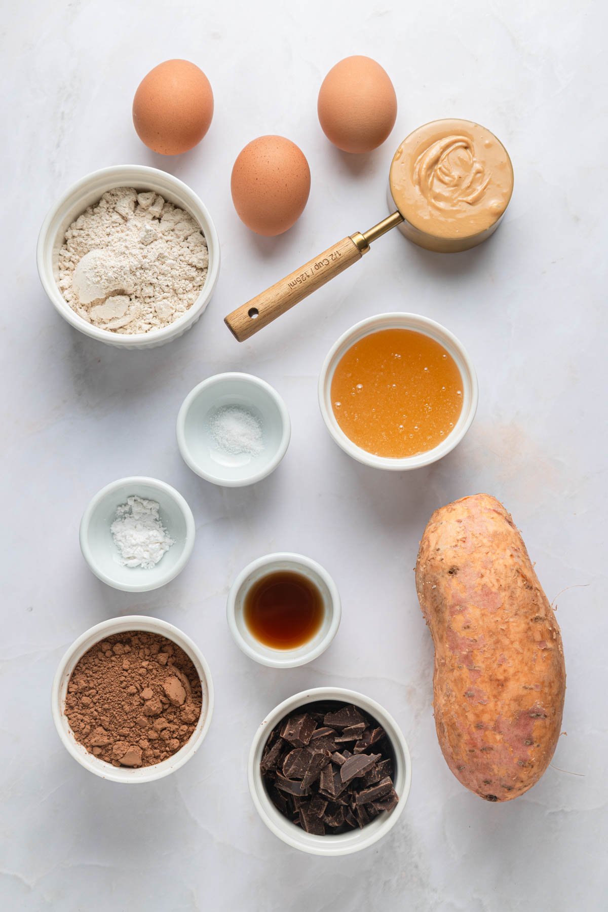 ingredients in a bowl for brownies, including eggs, peanut butter, sweet potato, and moreingredients in a bowl for brownies, including eggs, peanut butter, sweet potato, and more