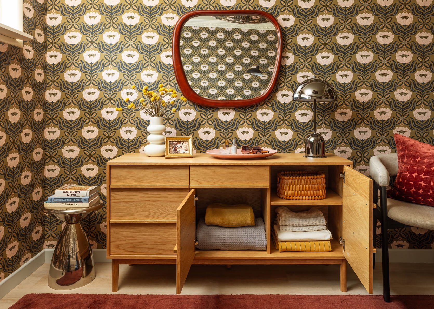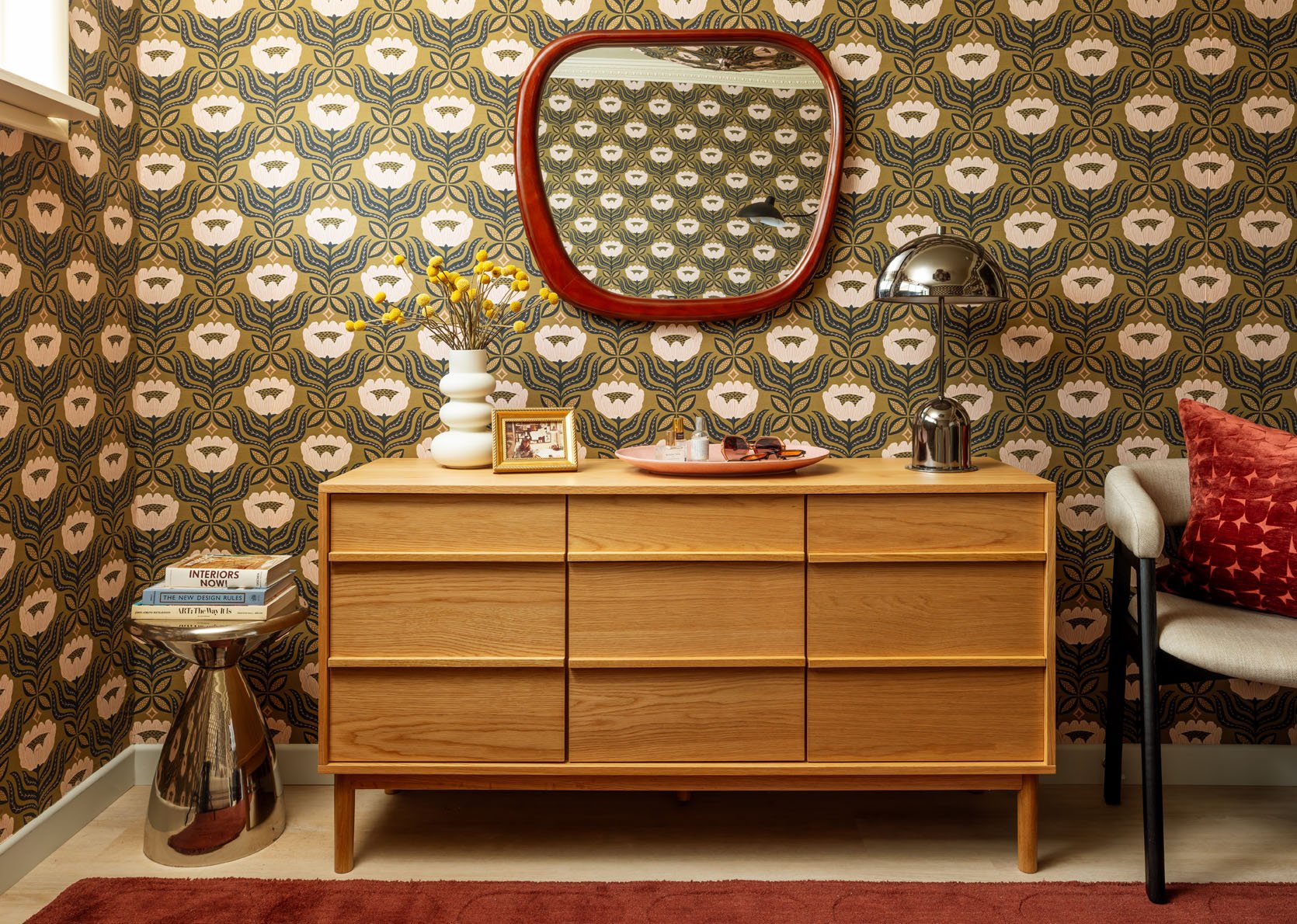 The little metallic facet desk within the nook was a last-minute addition (finally, a tall, spiky plant or slender bookshelf would possibly dwell right here as a substitute), however I really like what these balanced pops of chrome add to the house. The platter sitting on the cupboard works nice as a catchall, and the pink matches the flowers on the wall, however when guests come to remain, I’ll possible clear the floor to allow them to use it to unfold out and unpack. Nonetheless, one MUST omit a design-forward vase of flowers to correctly greet your visitors upon arrival!