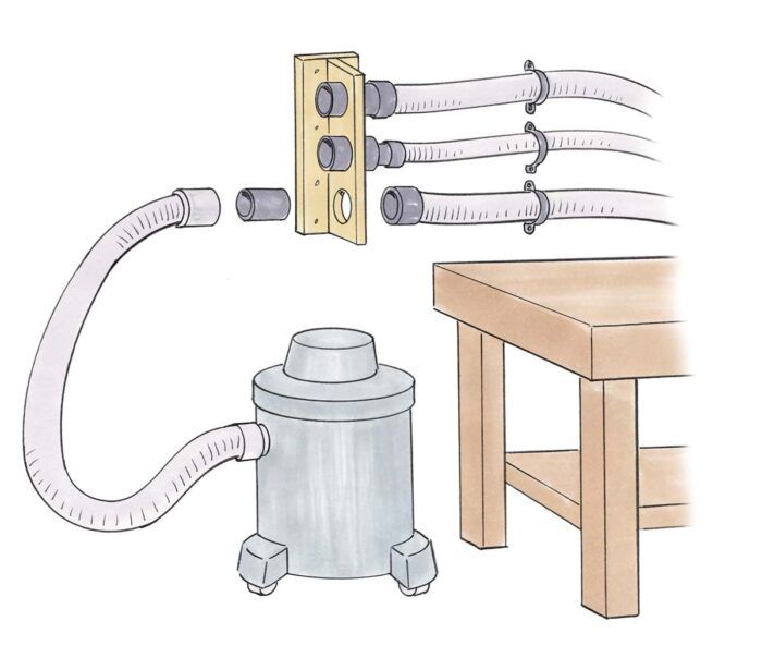 I borrowed this straightforward concept for a hose manifold from a tip by Chuck Lambert in FWW #229, updating it with dust-hose “splices” from Lee Valley, versus merely drilling holes in plywood. These hose connectors can be found for each 211⁄22-in.-dia. and 4-in.-dia. hoses, so the manifold concept will work for each store vacuums and full-size mud collectors. Not like Lambert, I mounted my manifold vertically, on the wall.