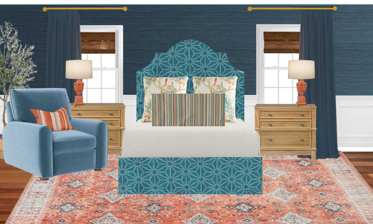 I’ve been looking excessive and low for a striped material to make use of on the mattress that brings the entire colours of the room collectively in a single material. I used to be initially searching for a large stripe, however the extra I examined out vast stripes on my bed room mockup, the extra I spotted that vast stripes distract from the hen material. So then I turned my consideration to materials with small stripes. However after a fairly exhaustive search, I couldn’t discover one which had the correct shade.