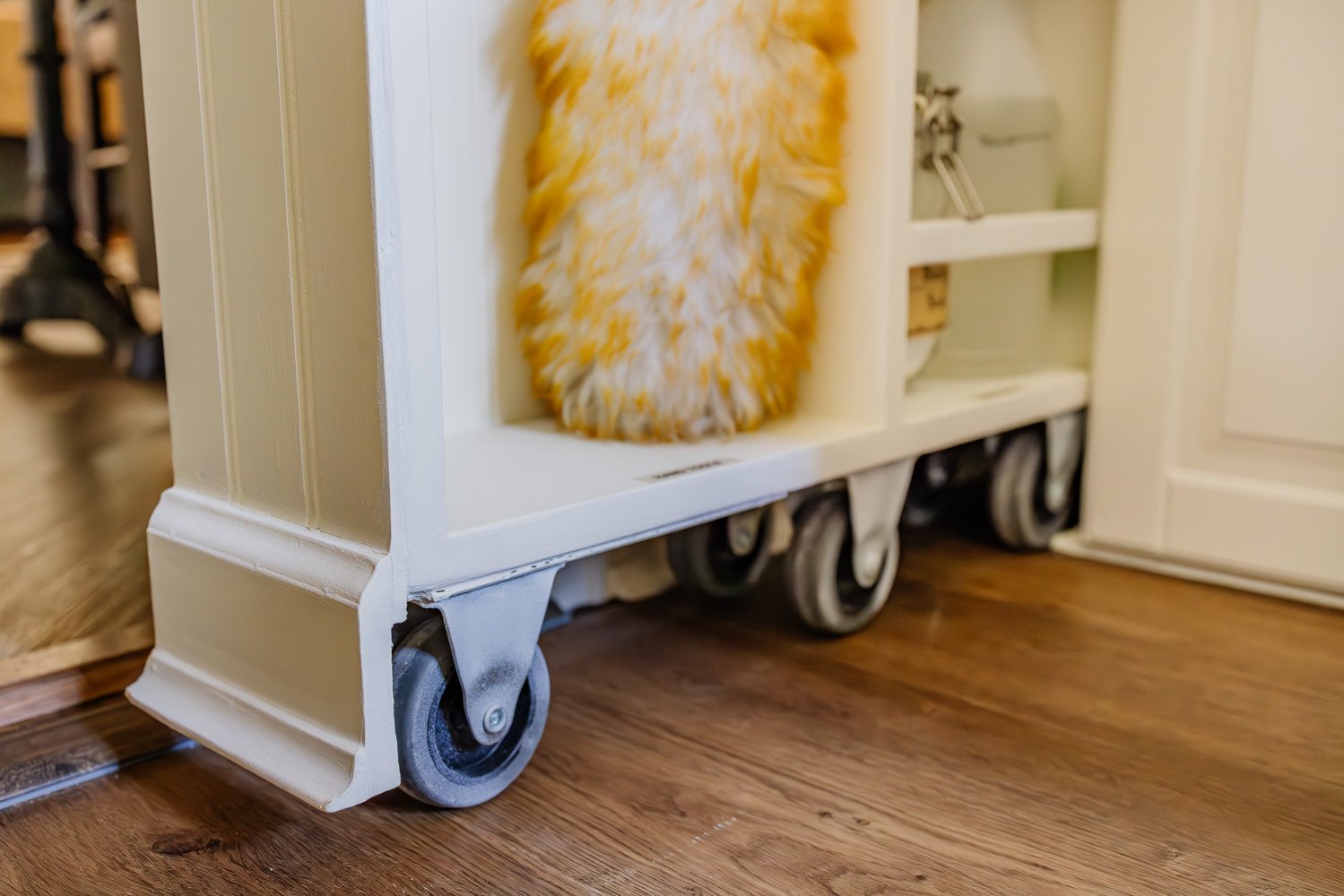 Since we couldn’t use a wall-mounted monitor, we mounted casters to the underside of the body so your entire broom cupboard might roll out simply.
