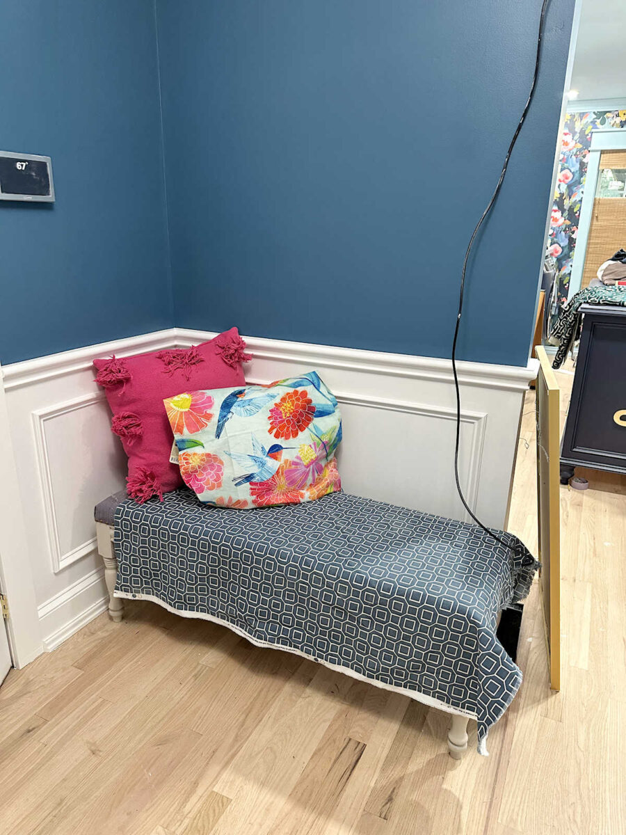 Within the meantime, I went rummaging by my cloth stash to see if I might discover something that might work. I didn’t actually have something available that might work for the bench, however I did discover this scrap of material and determined to strive it out simply to see if I appreciated the general sample and look. The colour itself is all unsuitable. It’s too blue to go in a teal lobby. however I do love the sample and the way the extra geometric sample seems with the colourful tea towel (i.e., future pillow cowl).