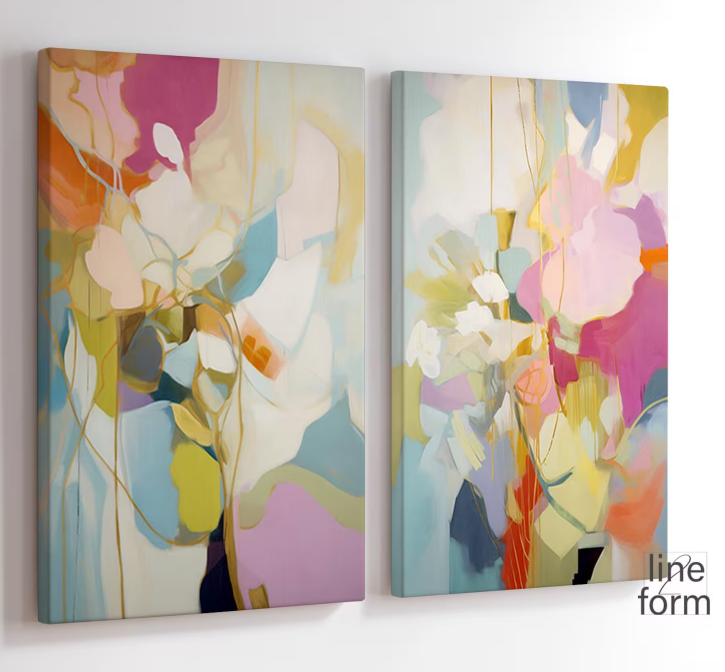 The third possibility was completely completely different. This colourful summary print set (a digital obtain) from Line2Form on Etsy (affiliate hyperlink) caught my eye for apparent causes. I’d solely be capable to use one in every of them, and I wasn’t positive if it will work due to the dominant fuchsia shade since our bed room has no pinks in it. However art work doesn’t need to match a room completely, so I stored it as a finalist.