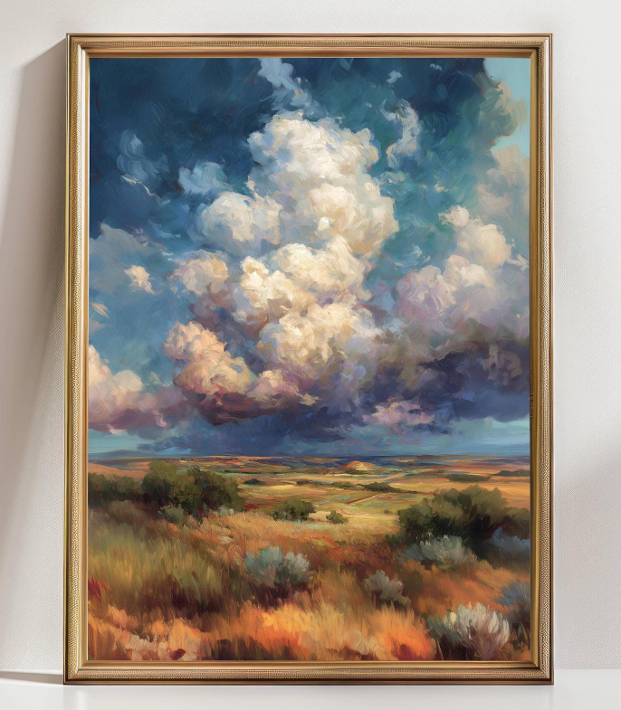 This Texas Panorama print from Hellstrom Prints on Etsy (affiliate hyperlink) was initially my favourite, however I used to be afraid that the general look may be too darkish in opposition to the darkish teal wallpaper. I hoped for one thing with the identical colours, however with an general lighter and brighter look to it. However this one ended up being the runner up.