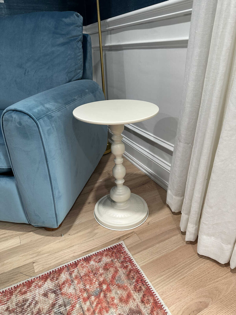 I additionally discovered the (soon-to-be) good facet desk for the recliner. I had my coronary heart set on a small desk with a turned wooden spindle look. All the actual wooden facet tables with turned wooden on Amazon seemed low cost to me (particularly, the way in which the spindle screwed collectively within the center), so I made a decision to pay attention extra on form (similar to the lamps) as an alternative of fabric. That’s when I discovered this cute steel facet desk (affiliate hyperlink).