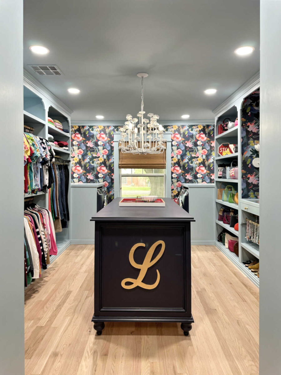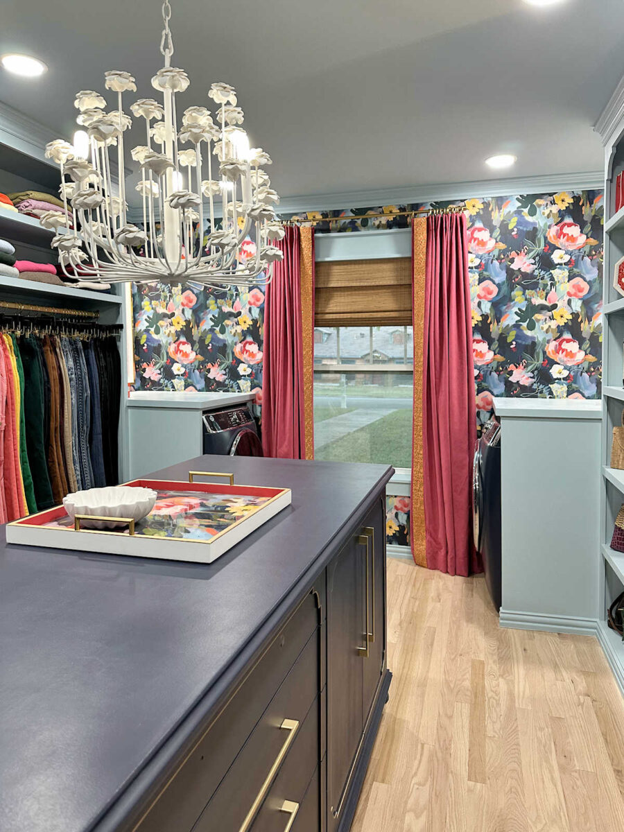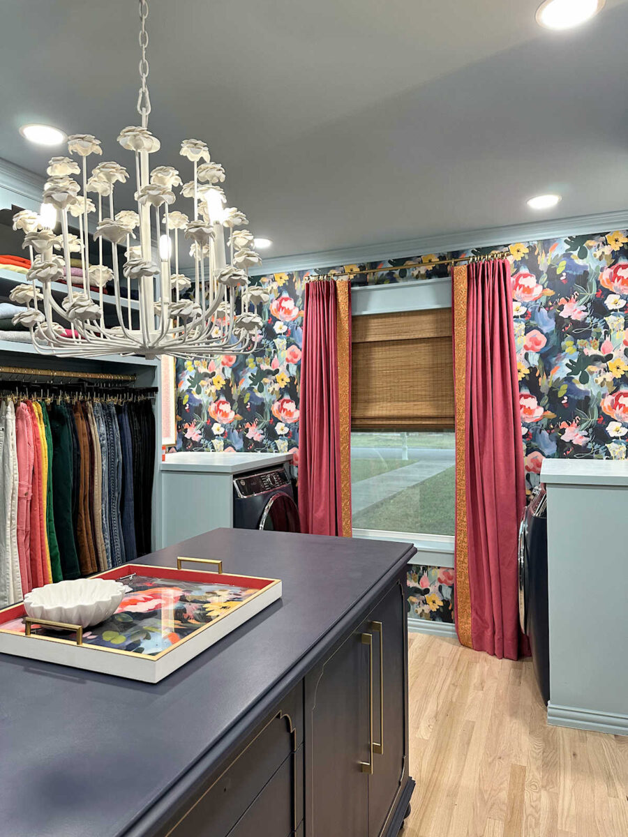 Within the meantime, whereas I really like, love, LOVE my closet, there have been a few issues that trouble me about it. First, whereas the wallpaper I selected is unquestionably a favourite of mine, that again (predominant) wall appears actually busy to me. Second, I don’t like that my chandelier will get type of misplaced in opposition to a busy background. And third, I simply need extra pink. I’m actually glad that I didn’t go together with pink for the island. I feel that might have been all improper, and the darkish blue turned out to be excellent for the island. However I’ve simply needed extra pink in there.