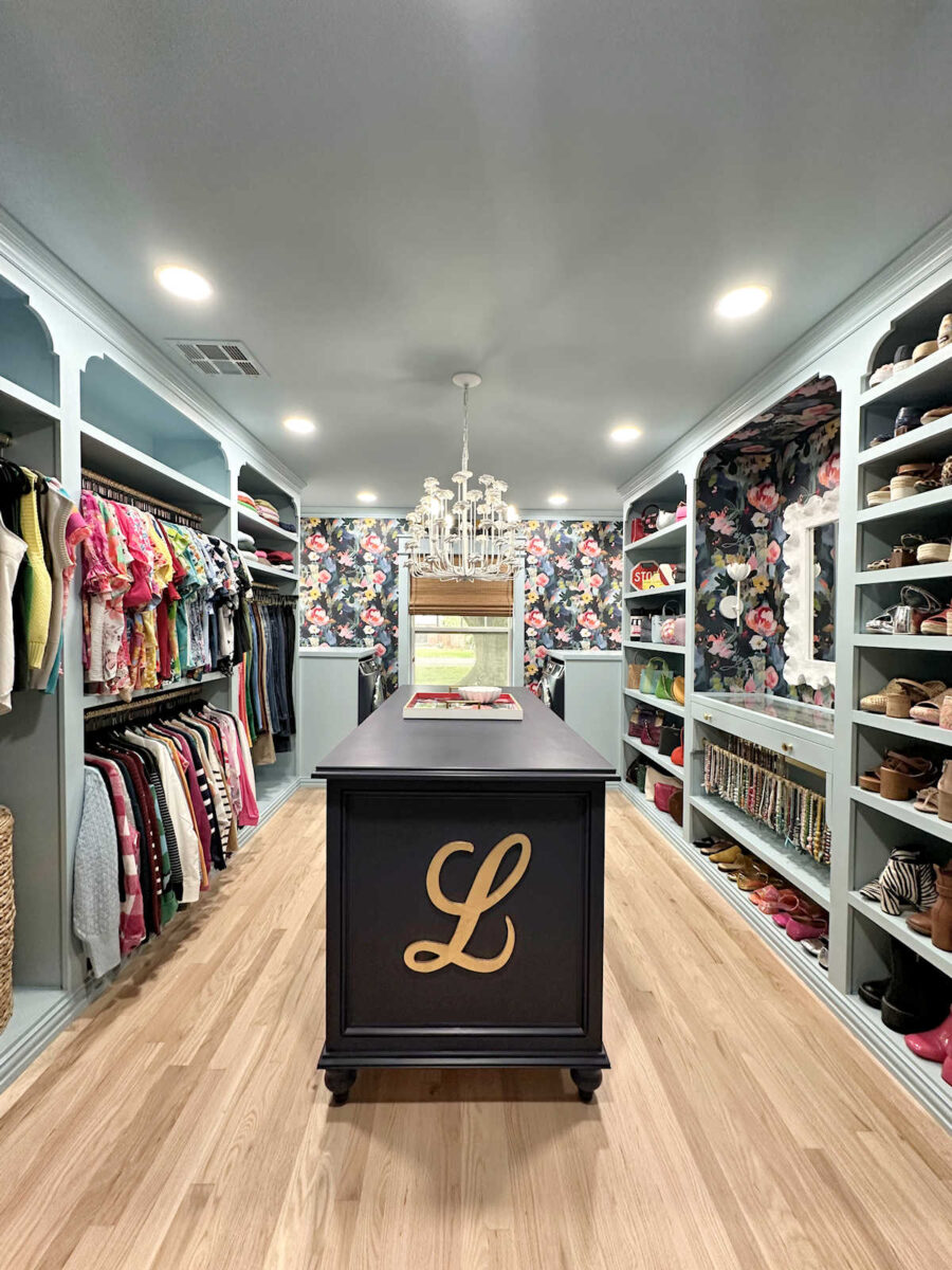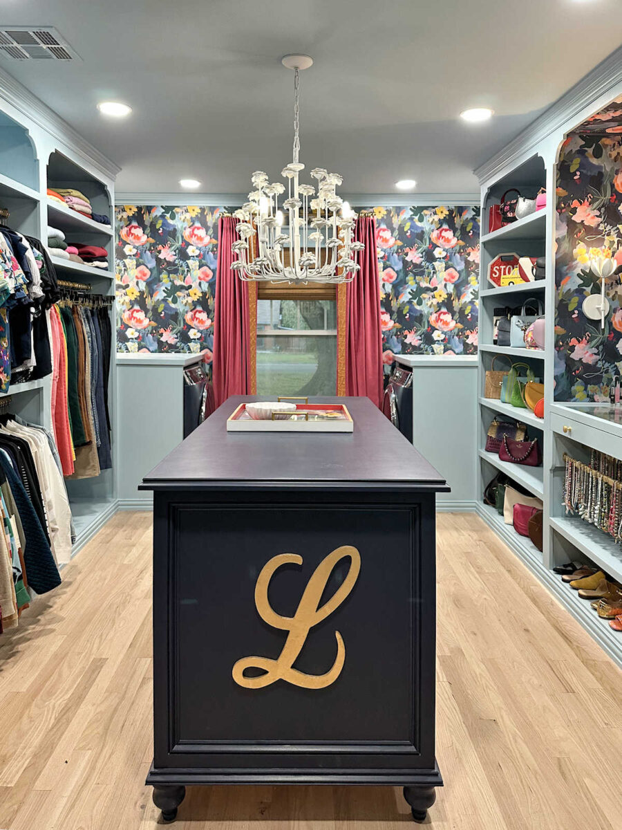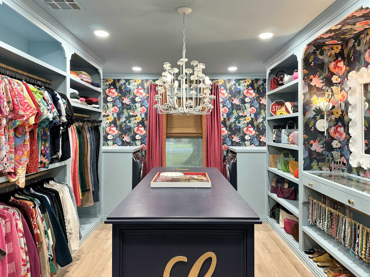 Within the meantime, whereas I really like, love, LOVE my closet, there have been a few issues that trouble me about it. First, whereas the wallpaper I selected is unquestionably a favourite of mine, that again (predominant) wall appears actually busy to me. Second, I don’t like that my chandelier will get type of misplaced in opposition to a busy background. And third, I simply need extra pink. I’m actually glad that I didn’t go together with pink for the island. I feel that might have been all improper, and the darkish blue turned out to be excellent for the island. However I’ve simply needed extra pink in there.