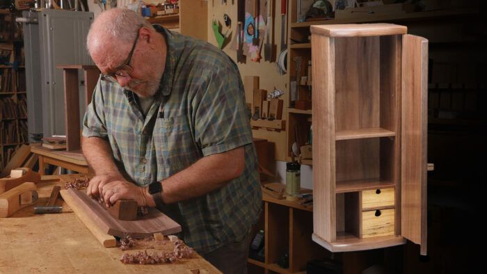 A cupboard’s case is normally made earlier than its door. However right here the curved door is the place to begin for each the design and the development. Making the door first means that you can draw a curved line you want—and a coopered door to match—with out being restricted by current cupboard dimensions. Working this manner additionally permits you to reply extra flexibly to the grain in your plank.