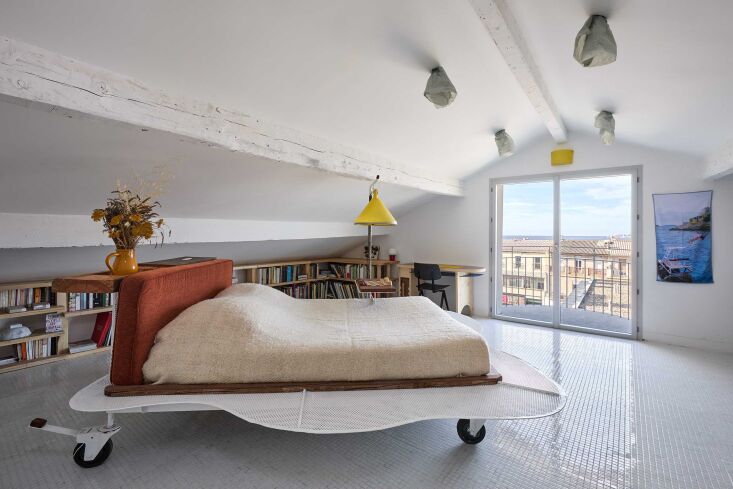 Above: The attic studio has modernist attraction: a tile flooring, painted rafters, and mattress on wheels. All of the furnishings is designed by upcycling workshop Ateliers Laissez Passer in Marseille from supplies salvaged from the Grand Port Maritime de Marseille. Above: For optimum flexibility, every part’s on wheels. Above: Beside the kitchen house: bookshelves constructed below the eaves and a spare mattress. Above: The modular kitchen contains a sink, tile and wooden worktops, and storage aplenty. Above A have a look at the reclaimed drawers… Above: …and yellow bowl sink. Above: The shiny flooring tiles have a glowy impact within the night gentle. Above: The balcony and—not pictured—a bathe room with a view. Above: The studio is on the market from €140/night time. For more information and to e book, head to La Traverse.