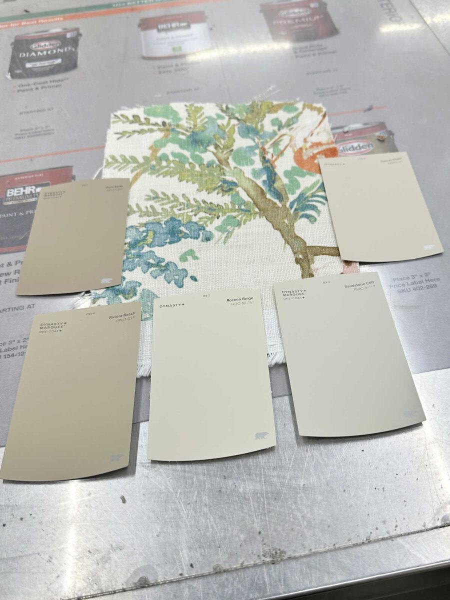 Talking of, I went to Dwelling Depot yesterday and picked up some paint samples for the dresser. I made a decision to go together with a impartial colour. I do know that’s utterly out of character for me, however I actually need to preserve the headboard wall the focal wall within the room. So these are the samples I picked up. I’m going to attempt these out at the moment. My favourite ones are the 2 on the best. The highest one is Behr Informal Khaki, and the underside one is Sandstone Cliff. However I’m going to check out all 5 and see which one appears one of the best within the room’s lighting and with the rug and chook material.