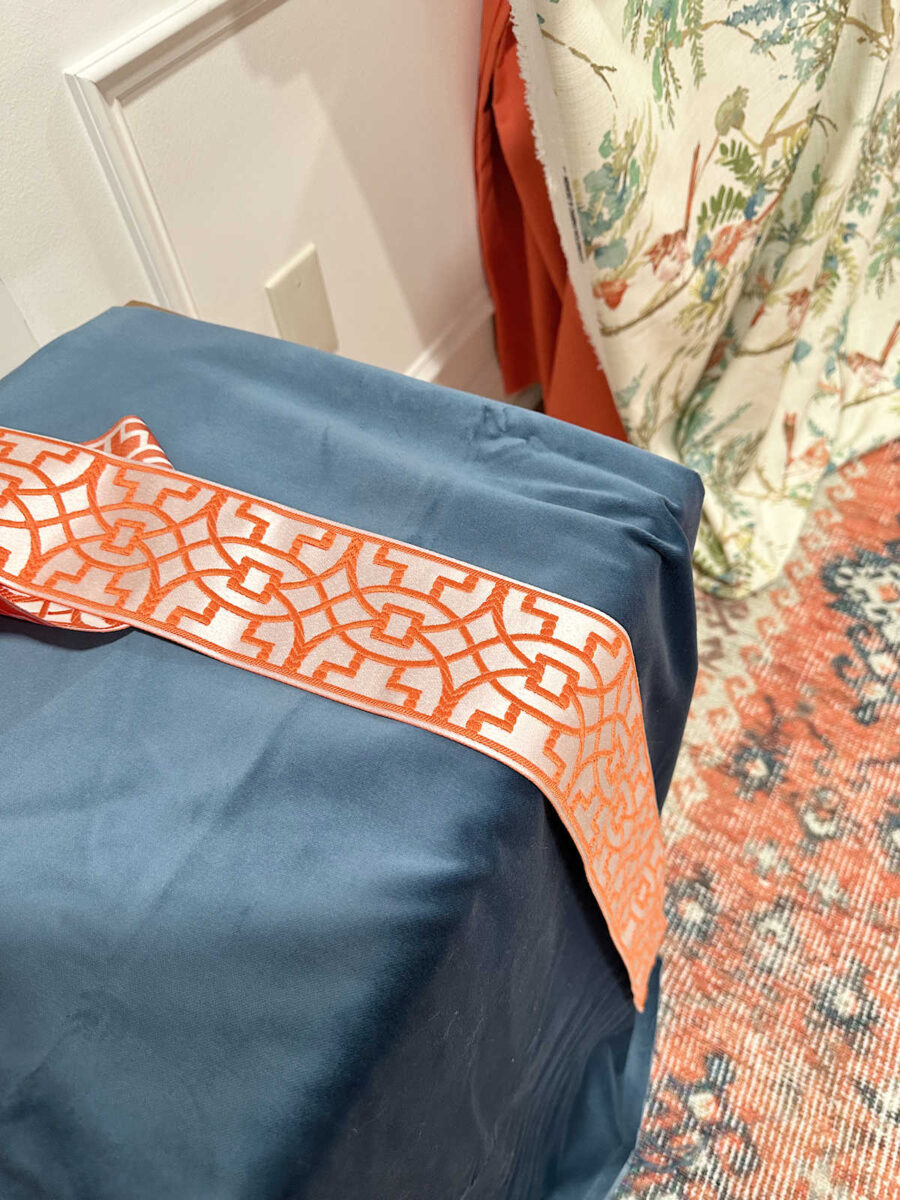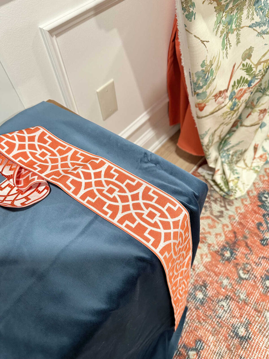 However I nonetheless assume it’s only a contact too vivid. All of it — the orange and the white — appear a little bit too vivid for the remainder of the gadgets within the room. So I believe I’m going to attempt to do one thing to tone it down ever so barely. I don’t need it to be utterly uninteresting and darkish. I simply need to do one thing to knock down that brightness only a slight bit. The one factor I can consider is to tea stain it with a really weak tea. I’m fairly certain it’s been over a decade since I’ve tea stained cloth, however fortunately, I’ve six further yards of this trim that I can mess around with. If there’s a unique means to remove a number of the brightness that you recognize of, aside from tea staining, let me know and I’ll check out that methodology as nicely.