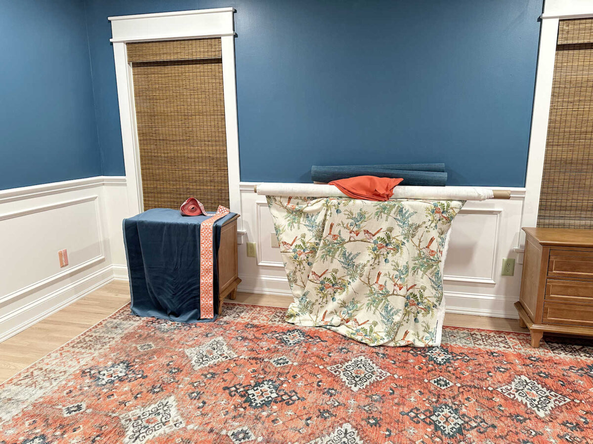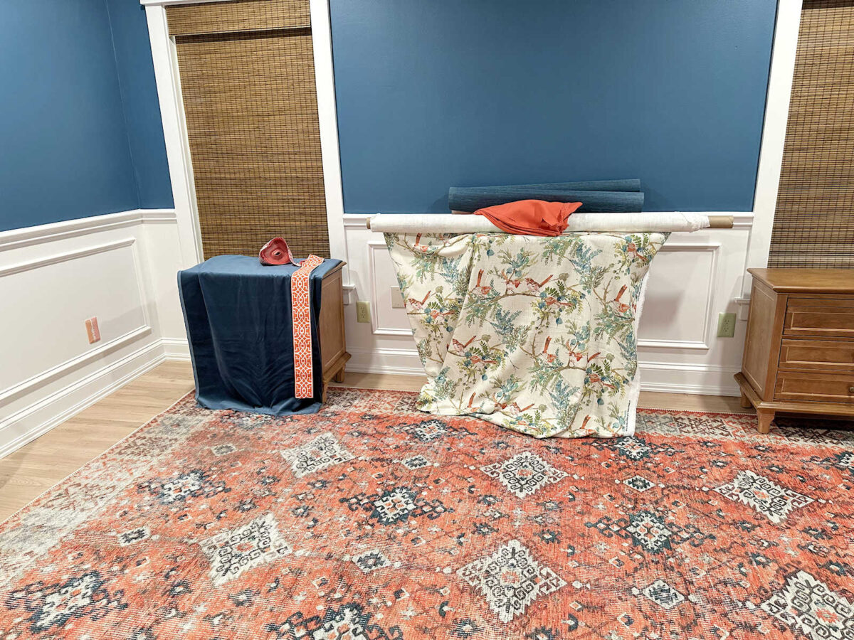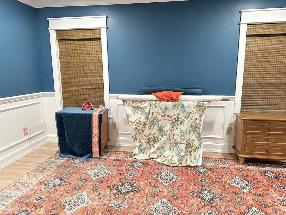 First, there’s the hen cloth that I plan to make use of on the headboard (I believe — that’s one of many issues I’m questioning). On prime of that, you’ll be able to see the orange/coral cloth that I plan to make use of on the welt twine across the upholstered headboard. And on prime of that, you’ll be able to see the precise grasscloth wallpaper, which is a bit darker and richer in colour than the present wall colour. After which on the left is the material cloth and the trim that got here in yesterday.