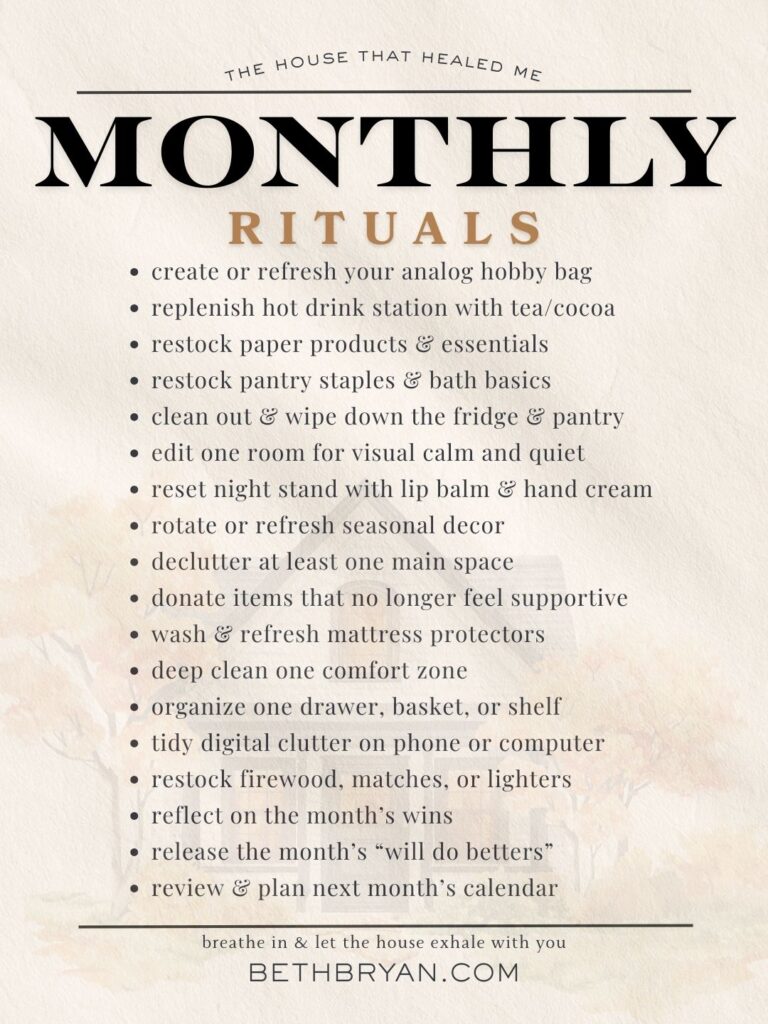 Month-to-month rituals give your home permission to exhale. You would possibly really feel your self exhale too.