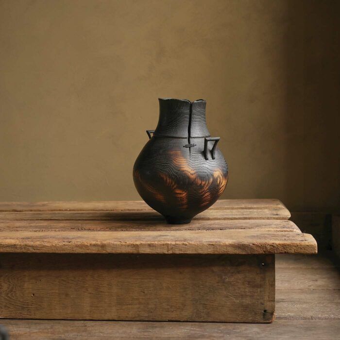 Turned from a single piece of inexperienced English oak, with handles integral to its physique, this piece by Barnaby Ash and Dru Plumb relies on the type of historic Greek amphorae, which had been vessels for water or wine. All of Ash and Plumb’s work derives from historic bronzes and pottery. They goal to not duplicate the originals that encourage them, however to interpret and reanimate them on the lathe. They favor inexperienced English oak, Ash says, “for the complexity of its grain and since it’s fairly vulnerable to warping and cracking, which fits our fashion of labor.”
