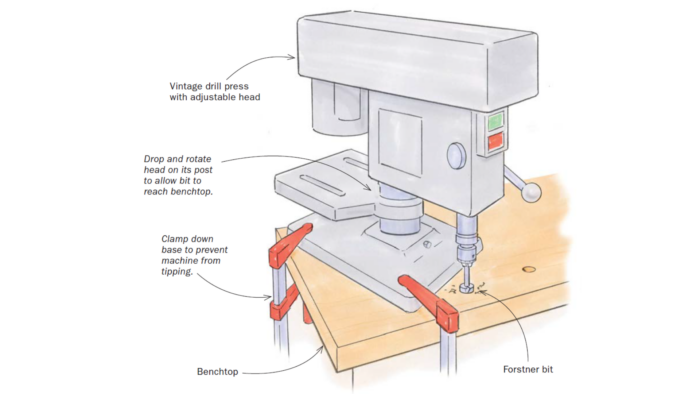It may be difficult to drill canine holes cleanly and precisely in a benchtop. However when you have an older drill press, you would possibly discover that it has a moveable head that may be lowered on its put up; this lets you decrease the pinnacle and pivot it sideways so you possibly can drill right into a benchtop. Get somebody that can assist you when lifting the machine onto the bench. Additionally, rotating the pinnacle could make the machine tippy, so clamp down the bottom for every new gap place. This methodology works for any holes that you must drill in the course of a big panel or slab.