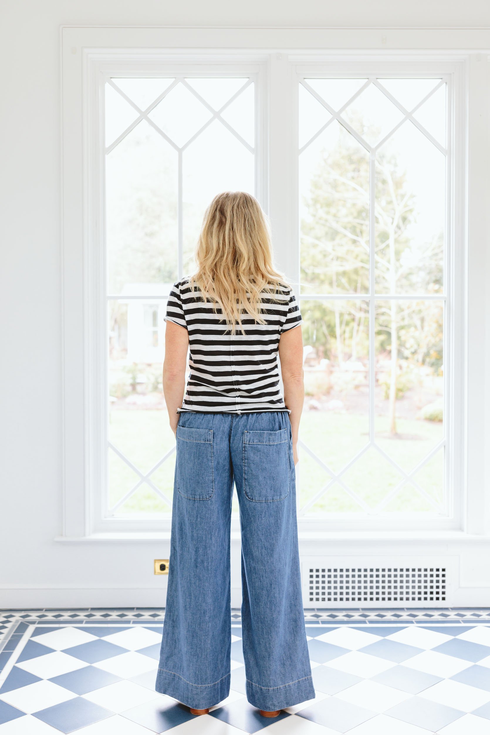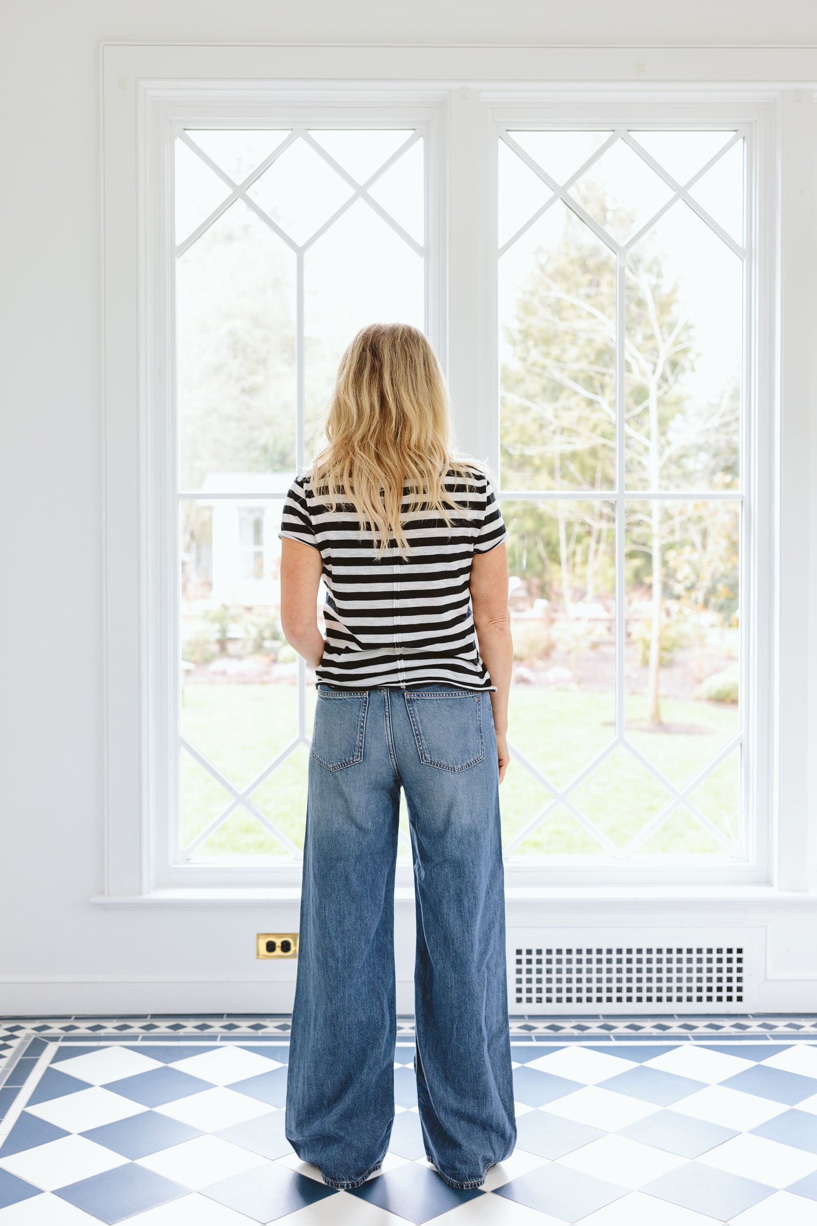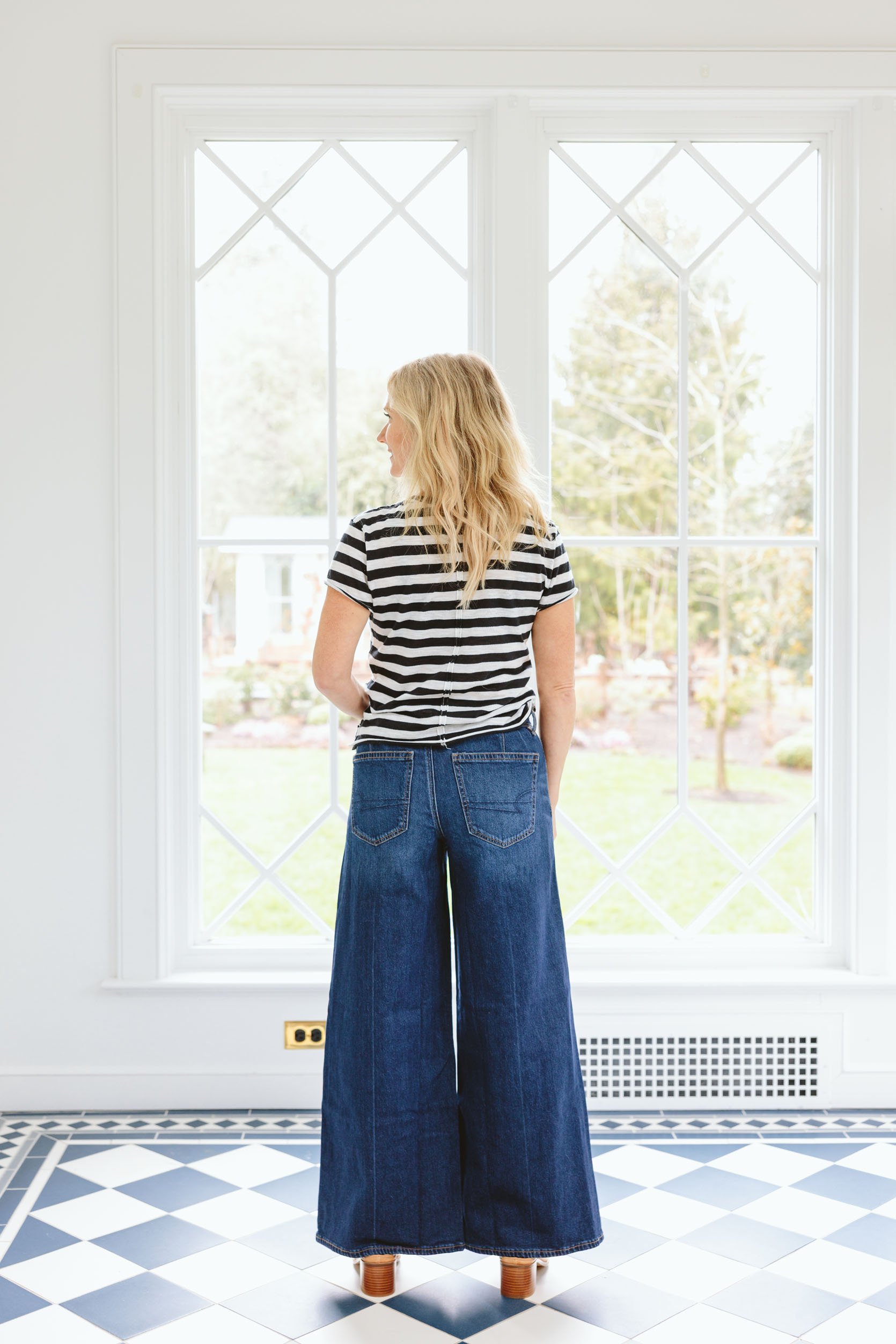 Typically for me, “extremely wides” might be actually unflattering as a result of there’s simply numerous quantity that may be overwhelming – however the way in which the highest of those is tailor-made round your waist and thighs, it has a pleasant slimming impact that then opens up into a large leg as a substitute of an enormous, broad floppy pant on you. And the darkish wash is so good.