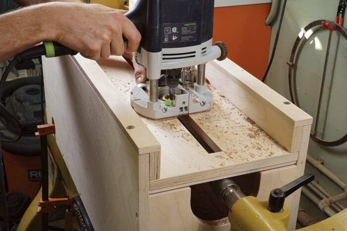 The jig is absolutely simply a big field that’s clamped to the lathe, with a detachable high plate that guides the router. The field has an extended cleat on the backside that matches between the methods of the lathe mattress, centering it and permitting it to slip facet to facet if wanted, and holes in its sides for clamping it to the mattress.