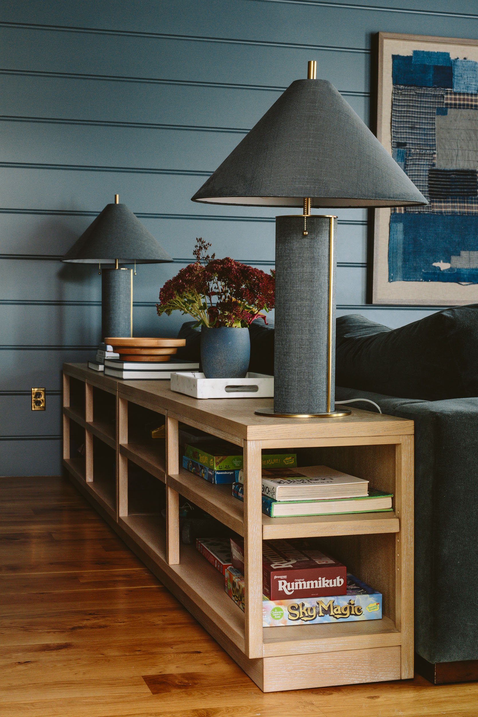 So these bookshelves truly moved UP a spot from final 12 months! They’re superior so this feels proper:) Right here’s what was stated final 12 months: “‘Because the couch is slammed up in opposition to the far wall and there was hardly any room for a aspect desk on this aspect of it, we wanted a settee desk,’ Em explains. ‘Enter this bookcase from Pottery Barn that matches PERFECTLY alongside the again of the couch and is the place my wine or tea sits once I’m watching TV (in addition to these attractive lamps). It appears to be like absolutely built-in and virtually prefer it was professionally designed!’ (Confession: I’m eyeing the identical bookcases to pair with my new sectional!)”