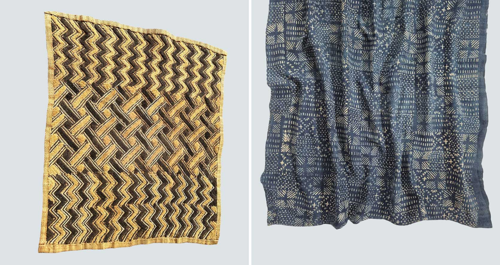 left: kuba raffia textile | proper: classic african mali indigo material