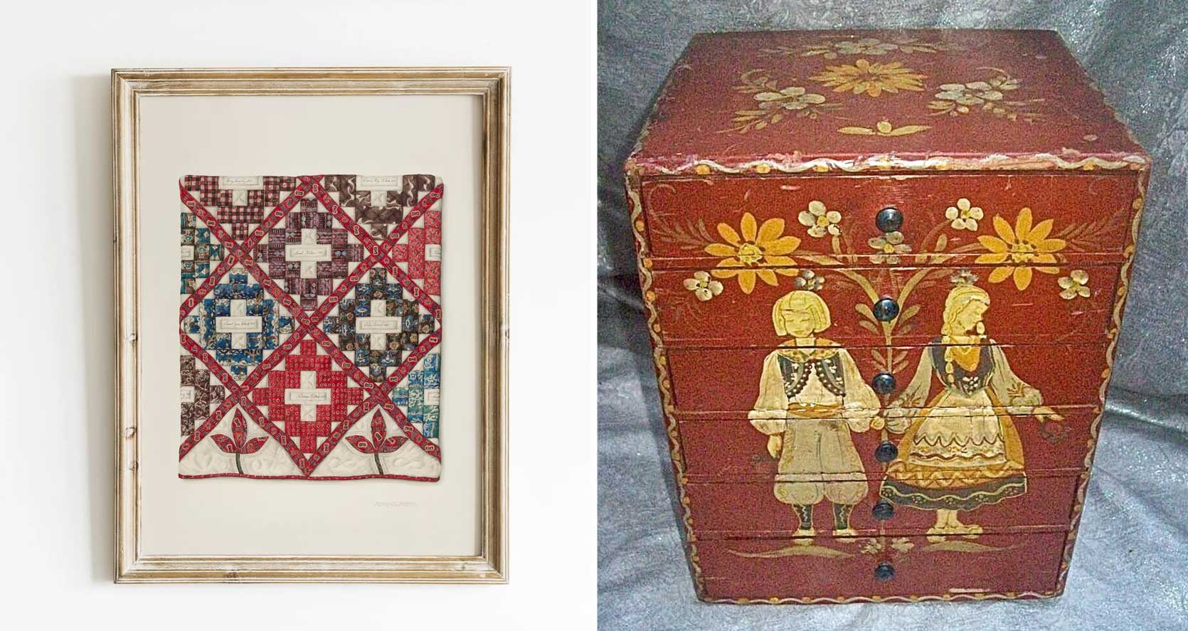 left: primitive people artwork quilt print: 1847 bedspread design | proper: vintage pennsylvania dutch miniature people artwork painted wooden wedding ceremony/dowry chest