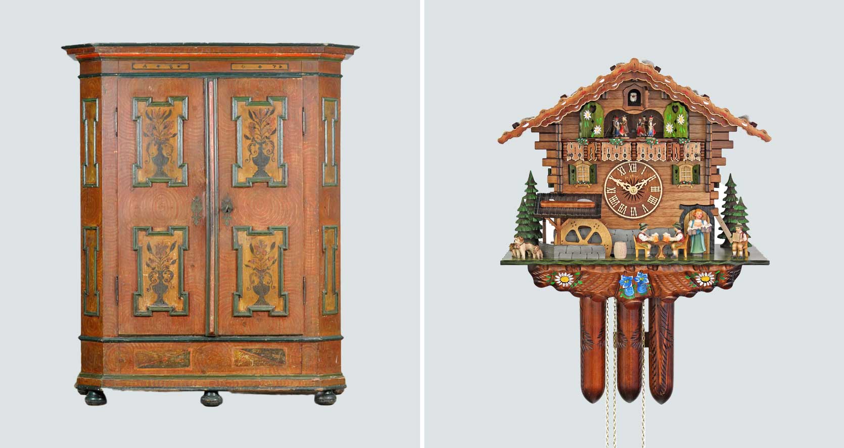 left: vintage south german people artwork hand-painted armoire, 1807 | proper: herrzeit by adolf herr cuckoo clock – the bavarian guesthouse