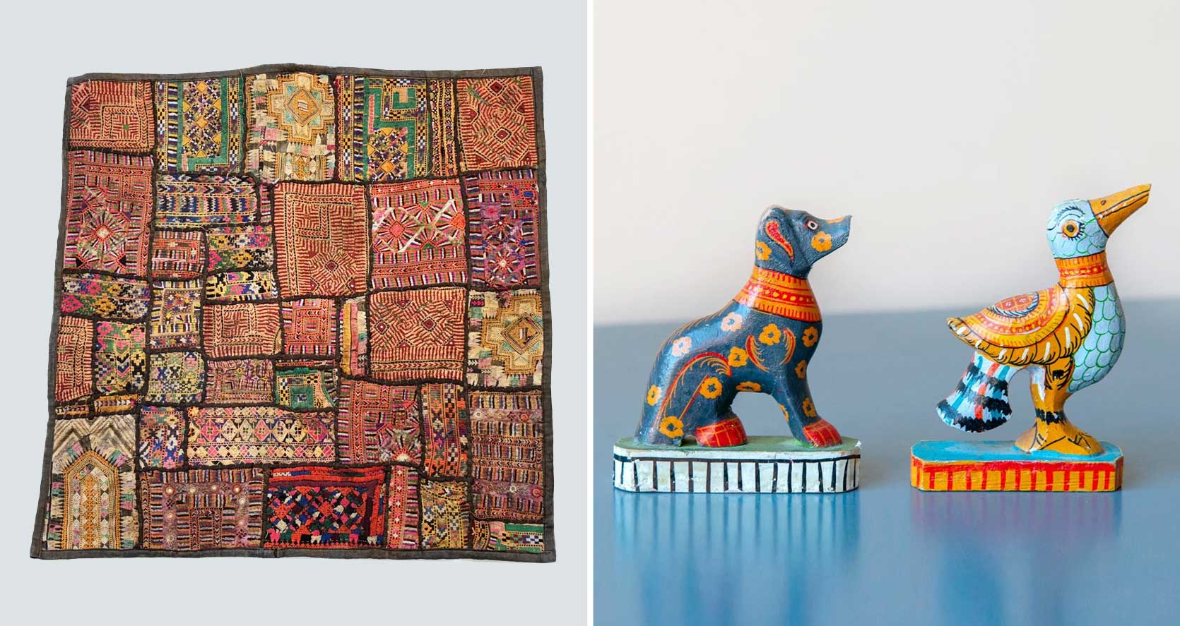 left: classic indian patchwork wall hanging | proper: set of two indian pattachitra ornamental folklore animals