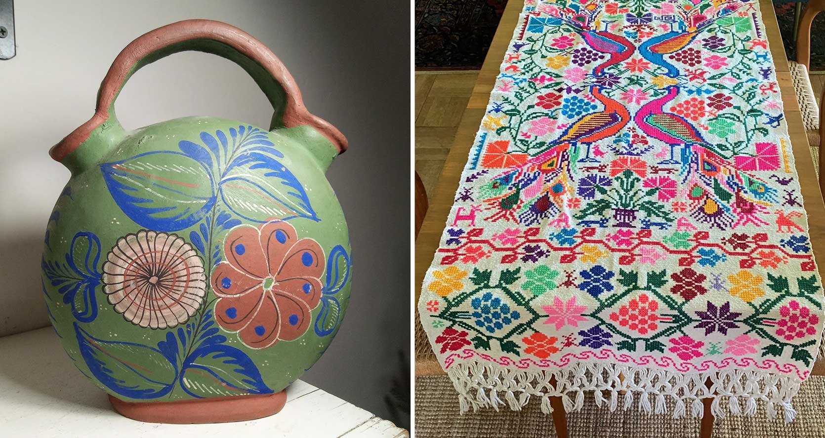 left: Forties unburnished mexican tonala wedding ceremony jug | proper: classic mexican embroidered desk runner