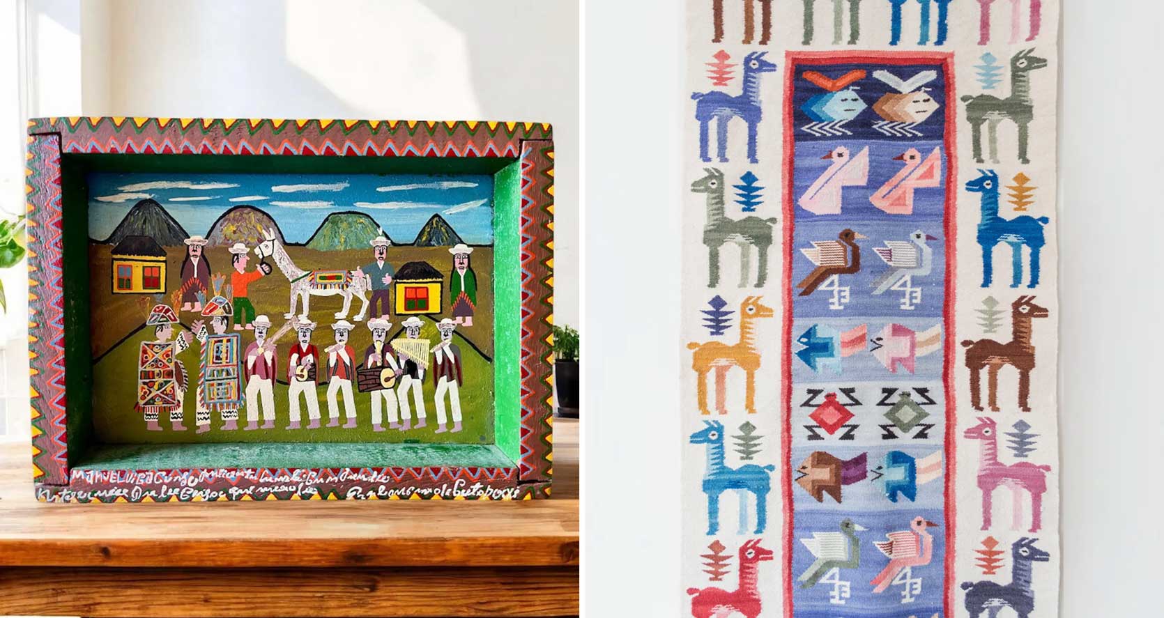 Peruvian People Artwork: A lot of Peruvian people artwork comes within the type of textiles corresponding to Andean blankets that depict traditions and non secular/devotional life, typically with Catholic iconography (and llamas…plenty of llamas). You’ll additionally discover painted ceramics and carved wooden with intricate patterns and narratives of festivals, saints, markets, and legendary tales. Frequent colours embrace deep reds, purples, browns, indigo, turquoise, vibrant pink, orange, and golden yellow.