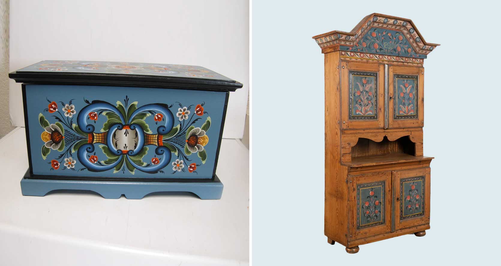 left: norwegian rosemaling on a wooden chest | proper: unique blue painted swedish pine dalarna cupboard cabinet dated 1821