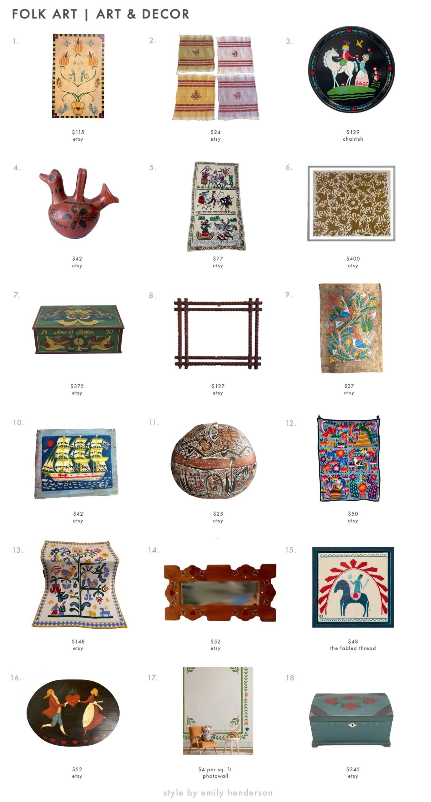 1. Pa Dutch Portray | 2. Set of 4 Classic Guatemalan Handwoven Textiles Coasters | 3. Classic Scandinavian People Artwork Steel Tray w/ Horse | 4. Classic Guatemalan People Artwork Clay Hen | 5. Classic Peruvian Wall Hanging | 6. Mexican Otomi Gold Hand Embroidered Wall Artwork | 7. Classic Norwegian 1930 Rose Painted Trinket Chest | 8. Bigger Easy Tramp Artwork Vintage Carved picket Image Body | 9. Classic Amate Bark Portray Seventies Mexican People Artwork | 10. Classic Greek Sailboat Portray on Salvaged Wooden | 11. Mate Burilado Peruvian Hand Carved Gourd | 12. Classic Hand Stitched Peruvian Model Embroidered Wool Wall Hanging | 13. Ukrainian Throw Hutsul Blanket | 14. People Artwork Beveled Mirror | 15. The Jabberwocky Act III Embroidery Package | 16. Pennsylvania Dutch Tole Painted Wall Hanging | 17. Flower Foliage Body – White II | 18. Vintage Norwegian Painted Jewellery Field Nineteen Twenties