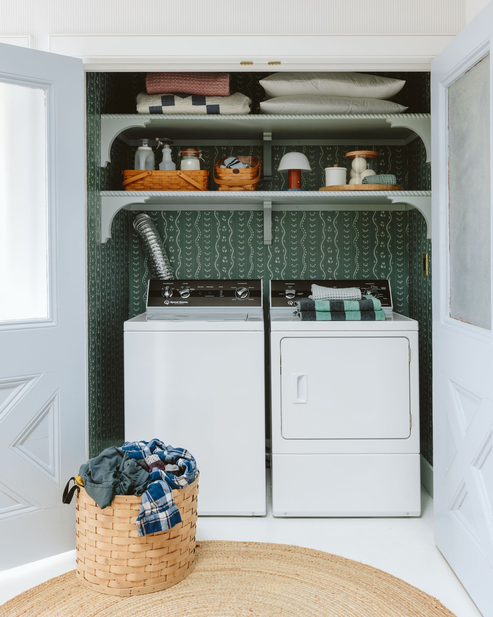 Ah, my laundry closet, which is painfully cute and will get a lot use. This was my first DIY wallpaper job (pre-pasted FTW) and so satisfying. That is additionally the place I revealed my love for “dumb” home equipment (i.e., the Pace Queen that’s traditionally probably the most long-lasting washer, that cleans the perfect regardless of trying so old fashioned). She’s a stable equipment! I additionally love the little rope element on the cabinets.