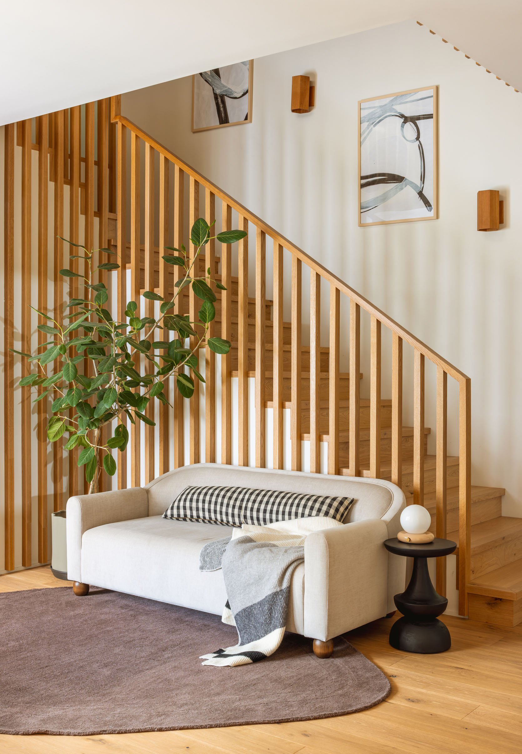 The lobby off the entry of the river home is one among my favourite vignettes. The distinction of the clear, spherical couch towards the busier striped heat wooden simply felt good.